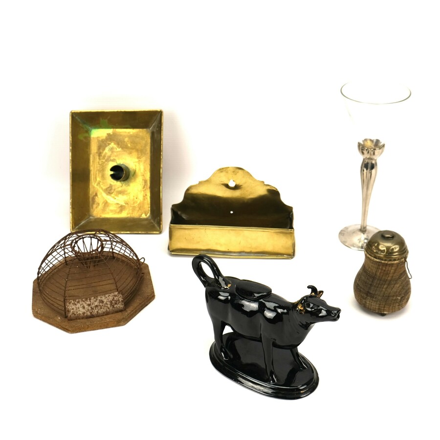 Lot diversen: Een antiek glas op verzilverde voet, zwavelstokpotje, messing blaker, kammenbakje, muizenval en aardewerken melkkan in de vorm van een koe