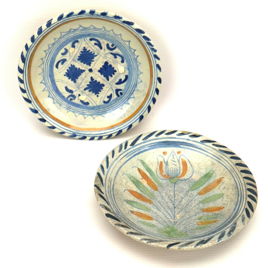 Twee antieke borden, waaronder een majolica schotel met polychroom decor van een tulp en kabelmotief als randdecoratie. Rotterdam, vroeg 17e eeuws.
