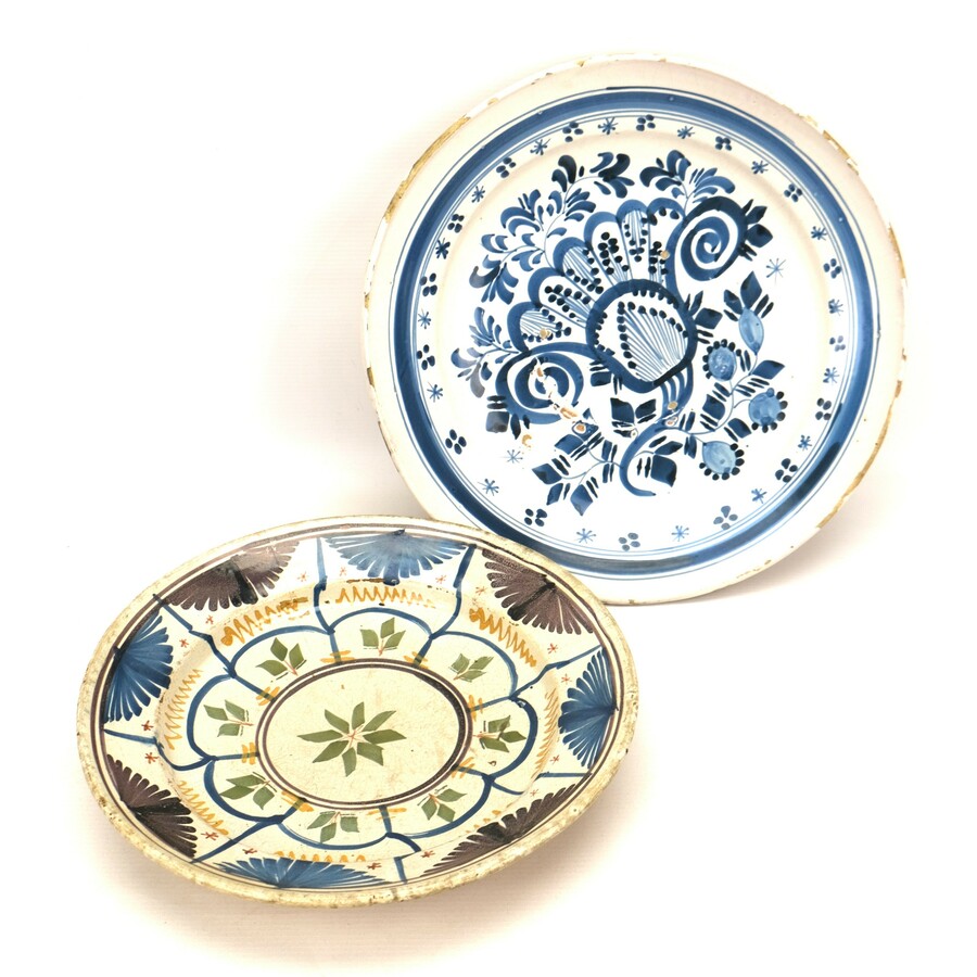 Lot van twee antieke schotels: een 18e eeuwse blauw-wit gedecoreerde schotel. Met daarbij een antieke majolica schotel