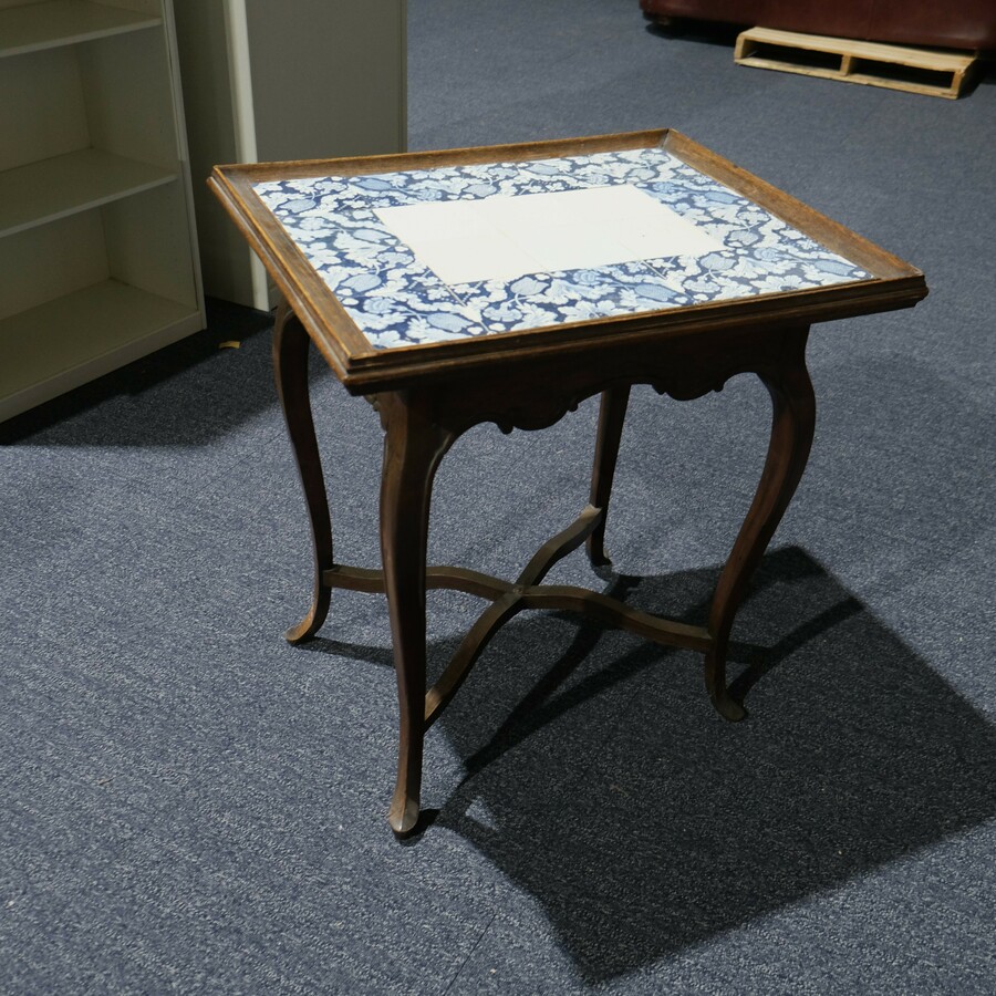 Een eikenhouten theetafelteje, ca. 1900, ingelegd met twintig tegels: zes witte exemplaren en veertien blauw-witte tegels met floraal decor