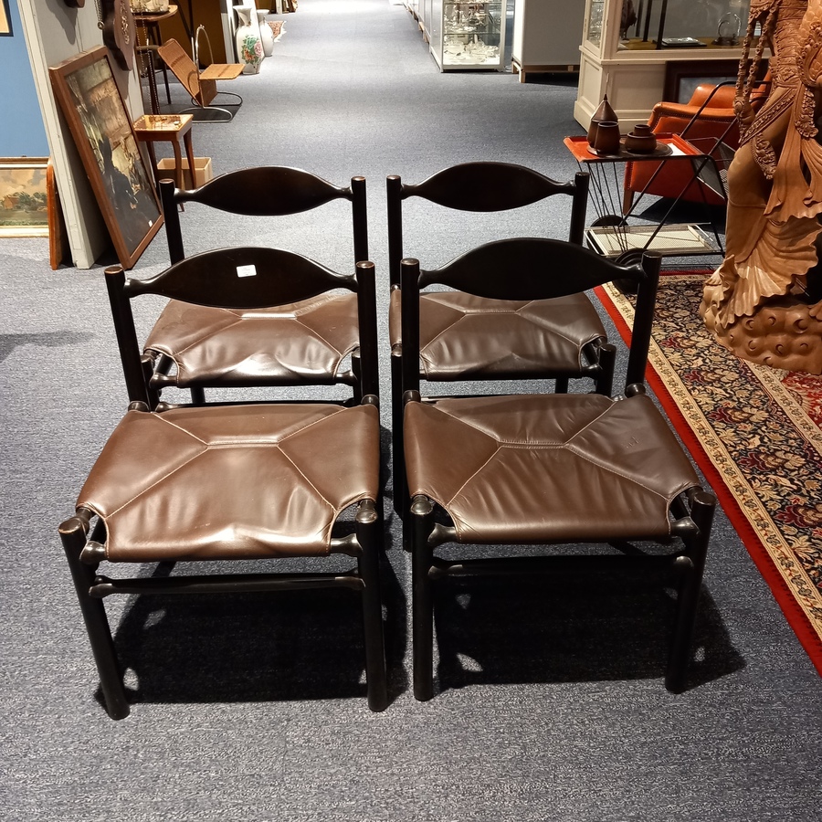 Vier zwarthouten designstoelen met lederen zitting, jaren '60 of '70