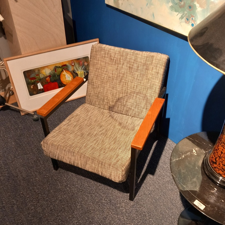 Twee design fauteuils, metalen frame met houten armleuningen en stoffen zitting. Ontwerp Hein Stolle voor Spectrum, ca. 1960