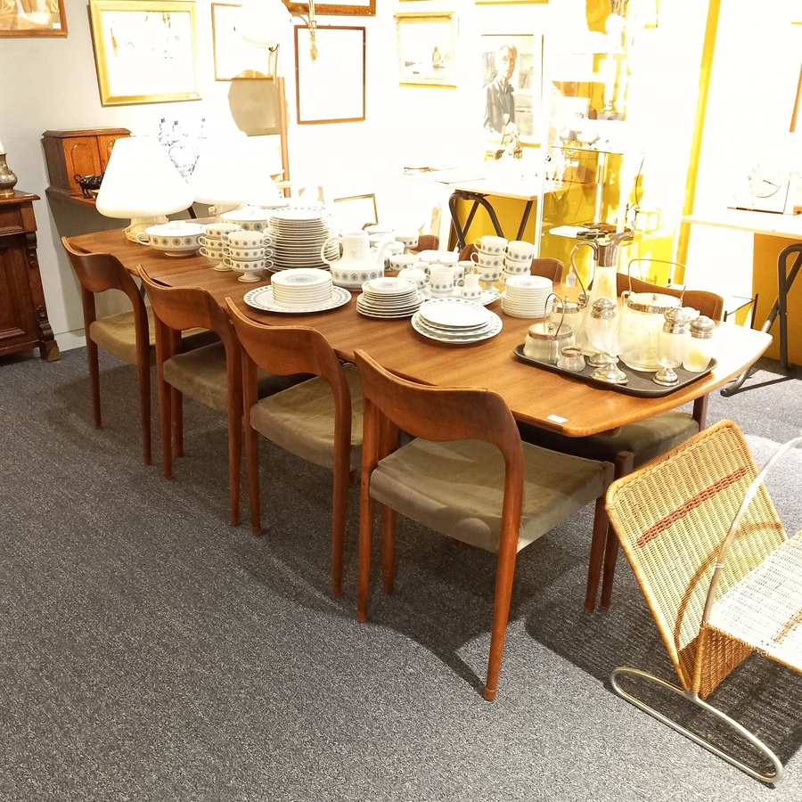 Een vintage eetkamertafel met uitschuifbare bladen en acht designstoelen met groene en blauwe bekleding. Ontwerp van Hovmand Olsen, vermoedelijk productie door Fristho Franeker in opdracht van m...