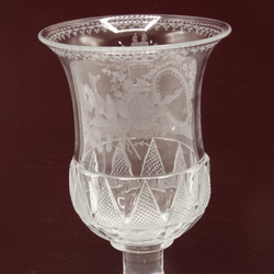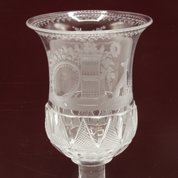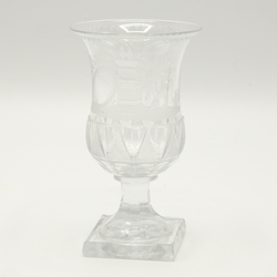 | Omschrijving | Een laat 18e of vroeg 19e eeuwse Duitse gegraveerde kristallen bokaal op vierkante voet, met decor van een hond zittend naast een altaar met twee brandende harten. |