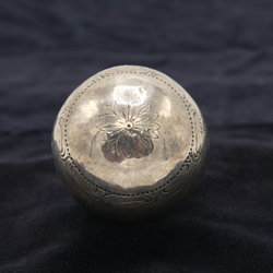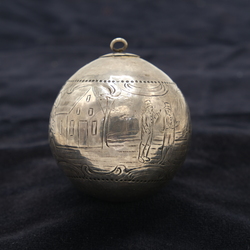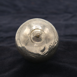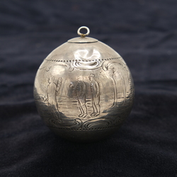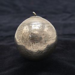 | Omschrijving | Een vroeg 19e eeuwse Fries zilveren kaatsbal. Gedreven decor van twee kaatsers, met aan weerszijden twee toeschouwers, en een herberg, tussen twee banden van alternerende voluten. Aan de onderzijde versierd met bloemmotief, tevens gemerkt met zwaardje en meesterteken PS in ruit = Pieter Jurjens Schmidt (1772-1849), werkzaam te Leeuwarden vanaf 1803 (Voet 541). Provenance: veilinghuis Ald Fryslan, 27 oktober 2003 |