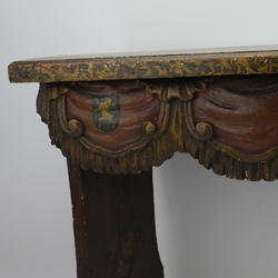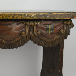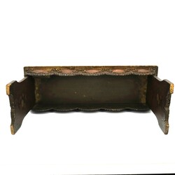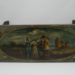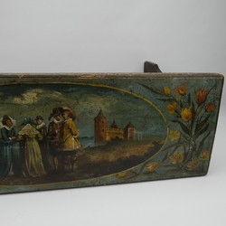 | Omschrijving | Een antiek 18e eeuws beschilderd bedsteebankje met gestoken rand en beschilderde voorstelling van edellieden voor een kasteel. |