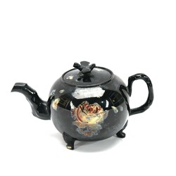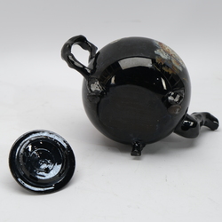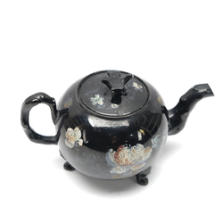 | Omschrijving | Een 18e eeuwse Engels zwart aardewerken theepot op drie voetjes zgn Jackware. Deksel bekroond met een duif en met resten van de koud beschilderde florale decors. Ca 1760. |