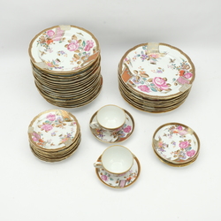 | Omschrijving | Lot diverse serviesdelen: zeventien soepborden (23 cm), allen ongemerkt, motief Lowestoft Rose. Met daarbij negen dinerborden, (26 cm), negen gebaksbordjes (16 cm), twee kop en schotels en drie losse schoteltjes, allen ongemerkt |