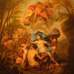 | Omschrijving | Schilderij, olieverf op doek in rijkgestoken ornamentenlijst. Mythologische voorstelling met saters, bosnimfen en putti's |