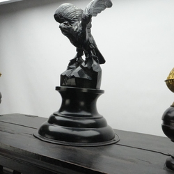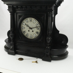 | Omschrijving | Een grote 19e eeuwse zwarte houten tafelklok, marmeren wijzerplaat met emaille wijzers, bekroond met adelaar |