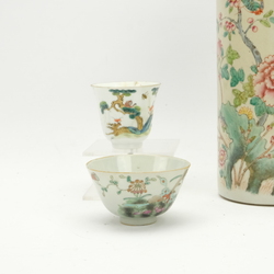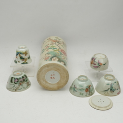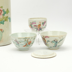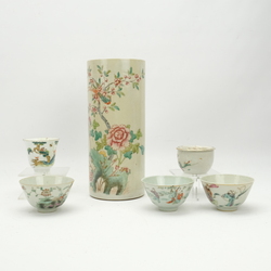 | Omschrijving | Drie Chinees Famille Verte porseleinen kommen, een kop, een rolwagen en een krekeldoosje. Met diverse decors van aap in de boom, ruiters, pioenrozen en vogels. 19e eeuws. |