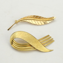| Omschrijving | Lot van twee 20e eeuwse gouden broches, waaronder één in de vorm van een veer. Veerbroche gemerkt '750' en 'VI 356'. Andere broche gemerkt '333' en 'GK' met daartussen een ster en maan = Gerb. Kuttroff. |