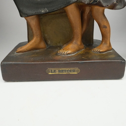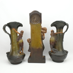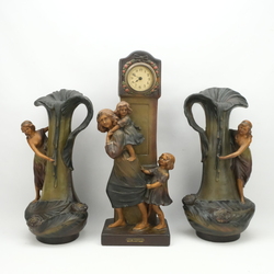 | Omschrijving | Een Frans jugendstil aardewerken pendule met twee siervazen, gemerkt ‘Le Retour’. Ca. 1900. Voorstelling van moeder met kind en twee vrouwen. Op de achterzijde gemerkt ‘535’ & ‘France’. |