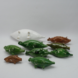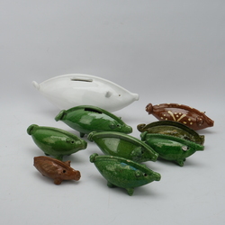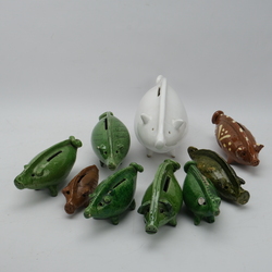 | Omschrijving | Lot van negen aardewerken spaarvarkens: een groot witgeglazuurd exemplaar, zes groengeglazuurde en twee met bruin glazuur, o.a. met slibdecor. 20e eeuws en antiek |