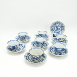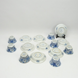 | Omschrijving | Acht Chinees porseleinen schotels met zeven bijpassende kopjes. Blauw/wit met een decor van gestillerde bloemen. Gemerkt met vier karaktertekens. Kangxi revival. 19e eeuws. |
