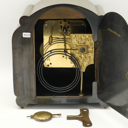 | Omschrijving | Een 20e eeuwse gepatineerde koperen Amsterdamse School Pendule met bronzen wijzerplaat, met goed lopend & slaand uurwerk en sleutel |