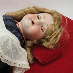 | Omschrijving | Een antieke Franse pop met papiermaché armen en benen. Een porseleinen hoofd. Gemerkt voor C. M. Bergmann, Walterhausen 1916, 61/2 uit ca 1916. Met blonde pruik. Gekleed en met een antiek bloedkoralen halssnoer voorzien van een 14 krt (585/1000) gouden kapitelslot. |