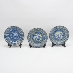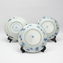 | Omschrijving | Lot van drie antieke 18e eeuwse Chinees porseleinen borden, decor met vlakverdeling op de rand met geometrische decor en kostbaarheden, op het plat voorstelling van bloemen en insecten. |