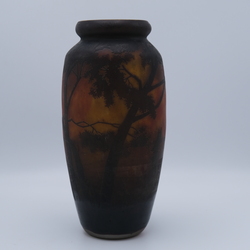 | Omschrijving | Een Frans cameo glazen vaas. Met een decor van diverse schepen aan de kust met bomen. Gesigneerd Daum, Nancy. Ca 1915. |