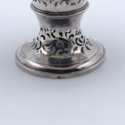 | Omschrijving | Een zware en kapitale 2e gehalte (835/1000) zilveren potpouri vaas. Rondom opengezaagd en met een bloem bekroond. Gekeurd met onbekende zilverkeuren. (Verzilverd??) |