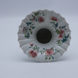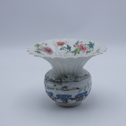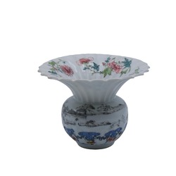 | Omschrijving | Een antieke 18e eeuwse Chinees porseleinen kwispedoor, gelobt en gecontourneerde rand. Aan de bovenkant Famille Rose emaille beschildering van bloemen, o.a. pioenrozen. Op de buik encre de chine decor van een landschap met rotsen en een fort. Yongzheng periode (1722-1735) |