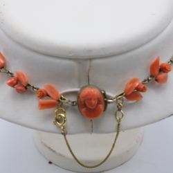 | Omschrijving | Een 20e eeuws bloedkoralen collier, fijn gestoken met afbeeldingen van rozen, met op een sluiting een camee |