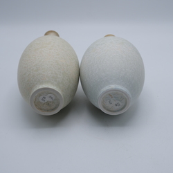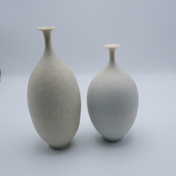 | Omschrijving | Twee wit porseleinen vazen met smalle tuit en voorzien van een kristalglazuur. Gemerkt aan de onderzijde Hein Severijns. |