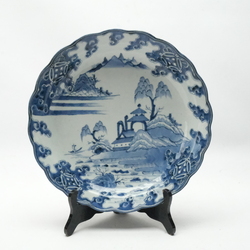 | Omschrijving | Een 18e eeuws Japans porseleinen bord/schaal met decor van een tempel en wilgen. |