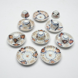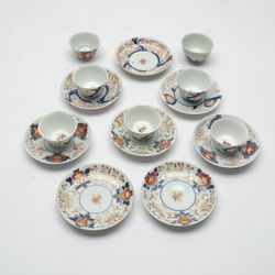 | Omschrijving | Lot van zeven kopjes en acht schoteltjes, Japans imari 18e eeuw. Verschillende decors, o.a. met vogels |