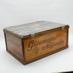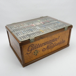 | Omschrijving | Een jaren ’30 Gütermann’s Nähseide winkelvitrine gevuld met naaigaren. |