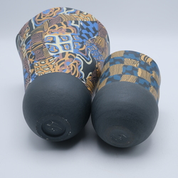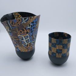 | Omschrijving | Twee keramieken design bekervazen opgebouwd uit diverse stukken gekleurde klei. Nerikomi stijl. Gemerkt aan de onderzijde Judith de Vries . |
