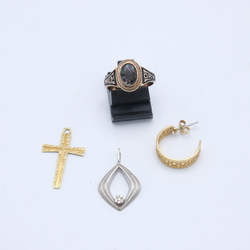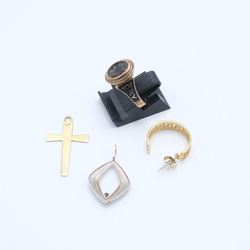 | Omschrijving | Lot diverse gouden sieraden: een 14 karaats (585/1000) witgouden hanger met kleine briljant geslepen diamant, een 14 karaats (585/1000) geelgouden hanger, Kruisje, een losse 14k oorbel en een antieke Engelse 9 karaats (375/1000) gouden damesring, met opschrift 'Memory' aan de voorzijde. Gemerkt '375', en meesterteken 'WGM', Chester, ca. 1900 |