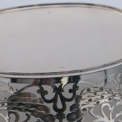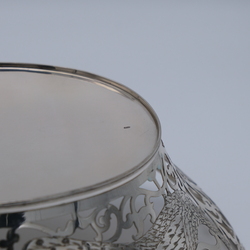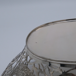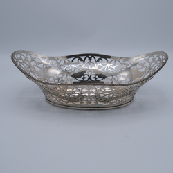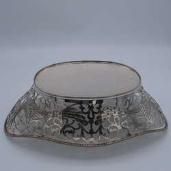 | Omschrijving | Een tweede gehalte (835/1000) zilveren broodmand, ajour gezaagd en gegraveerd met decor van pauwen, versierd met parelrand. Gemerkt Hendrik Hooykaas, jaarletter R = 1977. |