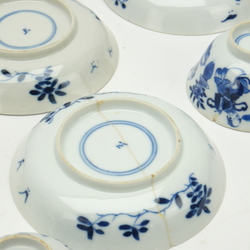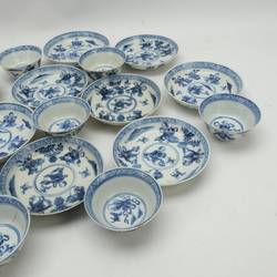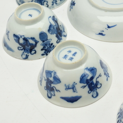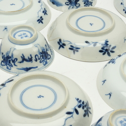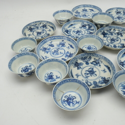 | Omschrijving | Lot van negen Chinees blauw-wit beschilderde porseleinen kop en schotels met decor van lijzen. Gedeeltelijk gemerkt met vierkaraktermerk. |