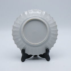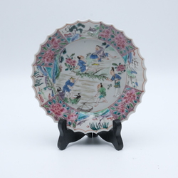 | Omschrijving | Een 18e eeuwse Chinees porseleinen schoteltje met gekartelde rand. Polychroom detailistisch en fijn beschilderd met vissers op een vlot met aalscholvers en vis etende figuren |