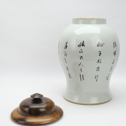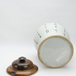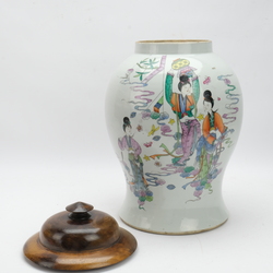 | Omschrijving | Een 20e eeuwse Republiek dekselvaas met decor van diverse figuren, met gedicht op de achterzijde & houten deksel. |