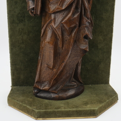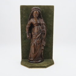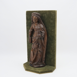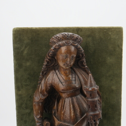 | Omschrijving | Een 17e eeuws eikenhouten sculptuur, voorstelling van St. Barbara, op fluwelen basement. |