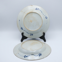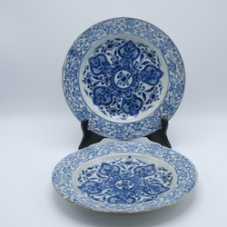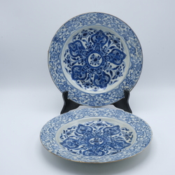 | Omschrijving | Twee Chinees porseleinen schotels. Blauw/wit met kostbaarheden op de randen en lotus motieven op het plat. Voor de Oosterse markt. Qianlong periode. |
