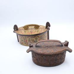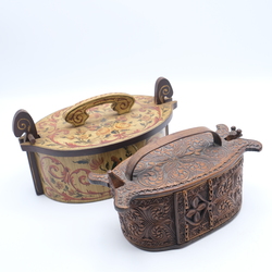 | Omschrijving | Twee spanen butte's, waarvan één zeer fijn gestoken met diverse decors, 19e eeuws. En één rondom Hindelooper beschilderd. Deze gesigneerd met een monogram voor Willem. H. Glashouwer (Hindeloopen 1913- Utrecht 1983). |