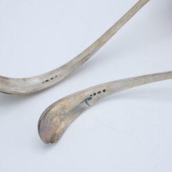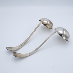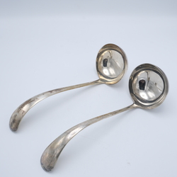 | Omschrijving | Lot van twee zware tweede gehalte (835/1000) zilveren soeplepels, Haags Lof. Mr. van Kempen. Beide gegraveerd met initialen aan de onderkant van de steel |