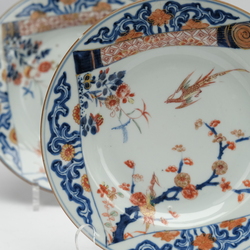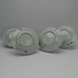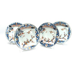 | Omschrijving | Vier vroeg 18e eeuwse Chinees porseleinen imari schotels. Met een decor van een opengerolde scroll met bloesemtakken met twee vogels. Ca 1720 |