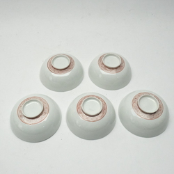 | Omschrijving | Lot van vijf 18e eeuwse Japans porseleinen kommen met overglazuur decoratie in groen, rood en blauw |