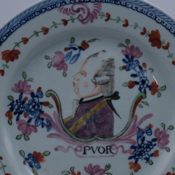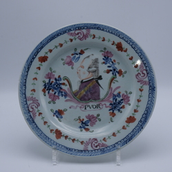 | Omschrijving | Een antiek 18e eeuws Chinees blauw-wit gedecoreerd porseleinen bord, Qianlong periode (1735-1796), met Amsterdams Bont decor, portret van Willem V met onderschrift 'PVOR' (= Prins van Oranje Nassau) |