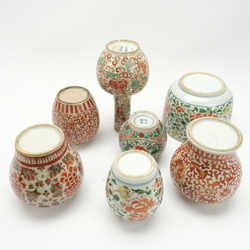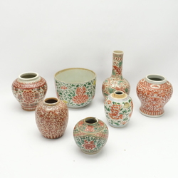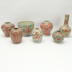 | Kavel | 443. Zeven stuks Famille verte en melk en bloed porselein |