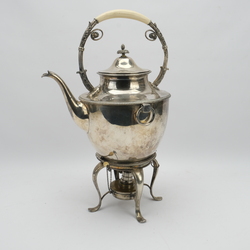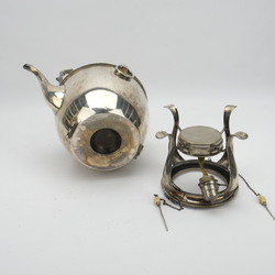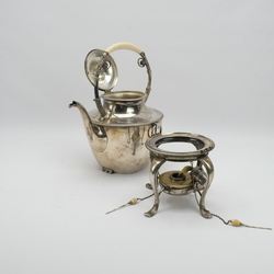 | Omschrijving | Een grote antieke tweede gehalte (835/1000) zilveren bouillore, gemerkt ‘900’. Brander onedel. |