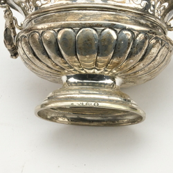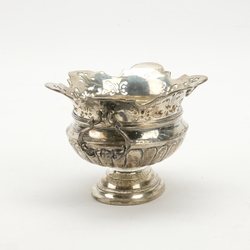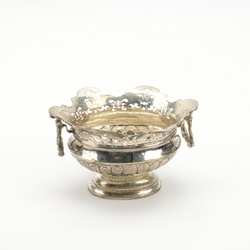| Omschrijving | Een laat 18e eeuws of vroeg 19e eeuws eerste gehalte (925/1000) zilveren kandijbakje, ajour gezaagd met gecontourneerde rand, twee hengsels en cannelures. Gemerkt met Frans garantiekeur (Oude man met cijfer '25', gebruikt voor middelgrote objecten tussen 1798-1807), zwaantje, letter 'N' en meesterteken 'IR". |