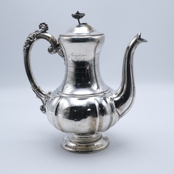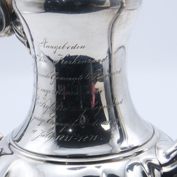 | Omschrijving | Een antieke laat 19e eeuwse tweede gehalte zilveren koffiepot met inscriptie ‘Aangeboden door den Kerkenraad der Hervormde Gemeente te Rauwerd met de ingezetenen aan Dr. R. L. Kijlstra ter gelegenheid zijner 50 jarige Evangeliebediening 16 juli 1821-1871’. Gemerkt van Kempen |