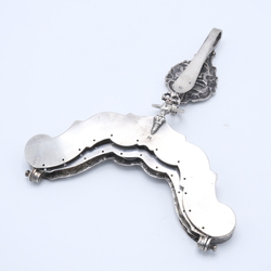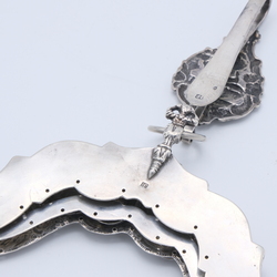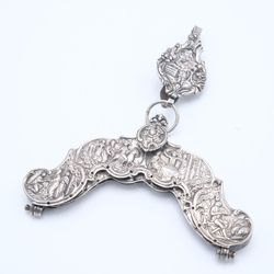 | Omschrijving | Een antieke 18e eeuwse Fries zilveren tasbeugel, met binnenbeugel. Versierd met Bijbelse voorstellingen. De haak met voorstelling van Abrahams Offer en gemerkt met meesterteken 'IP' = Johannes Pot II, Rotterdam na 1774. De tasbeugel versierd met vier voorstellingen met figuren tussen rocailles, o.a. man op paard en figuren aan tafel. Gemerkt 'IF' = Johannes Feddema, Leeuwarden 1780-1811 (Voet 529) |