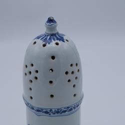 | Omschrijving | Een 18e eeuwse Delfts of Frans Rouen aardwerken suikerstrooier. Met een blauw/ wit bladerdecor. Ca 1750. |