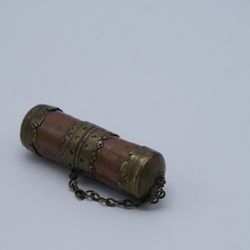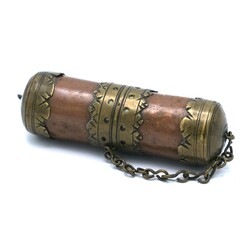 | Omschrijving | Een 18e eeuws messing met koperen tondeldoosje met ketting. Met twee compartimenten voor tondel en vuursteen. |